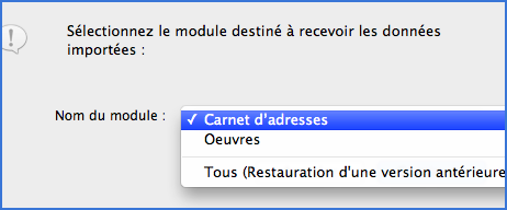 Seuls les modules Carnet d'adresses et Oeuvres sont, pour l'instant, capables de recevoir des données de façon intuitive. Si vous avez des factures, des événements ou d'autres données compatibles à importer, contactez notre support technique.