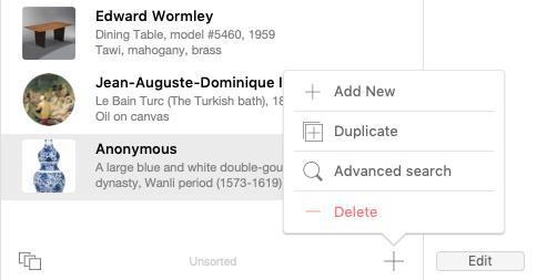 Advanced search can be useful if you want to isolate a set of records based on specific criteria; for example, if you want to display only the objects purchased from an artist during a given period.