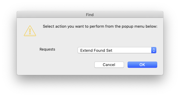 If you wish to add another location to the found records, activate the Advanced Search again, enter the new location and press the Alt key on your keyboard when validating the search. A dialogue window will prompt you to choose one of the following options: Perform Find, Constrain Found Set, and Extend Found Set. To add the new search to the already found set, choose the third option as in the screenshot below.