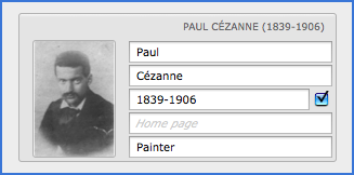To insert a picture of an artist, double-click directly into the picture field (see figure below). If an image already exists, delete it using the Delete key, confirm the entry by clicking outside of the field and double-click again inside to activate the choose dialog. Insertion can also be done by drag and drop. Since version 2.0.6, the image is automatically resized to fit the field (75 x 107 pixels). Obviously, you can also prepare the image with this size before inserting with an image processing software. For the old images, the submenu Records -> Other ... -> Resize Image (75 x 107 px) allows you to adapt the image dimensions to the field size.