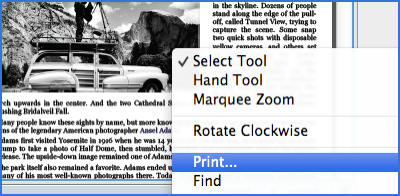 The PDF files are exportables, and can be edited in their original applications via the button Export (see screen capture above). If you want to print those documents, find or select texe text inside this documents, just right-click on the document and choose the action.