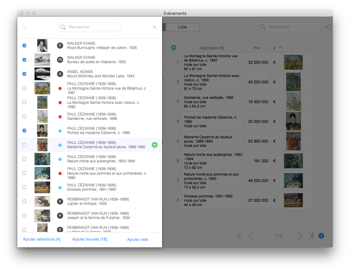 Ce module peut servir pour préparer des événements réels comme les foires ou les expositions en galerie, mais aussi pour créer des sélections d'œuvres à des buts divers : impression, envoi, exportation, rappel.