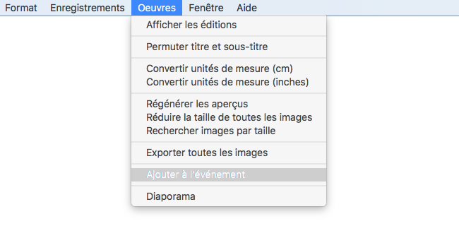 4. Tout en étant dans Œuvres, allez à Œuvres dans la barre des menus et cliquez sur Ajouter à l’événement (voir capture ci-dessous). Pour ajouter plusieurs œuvres, faites une recherche ou une sélection d’œuvres en mode Liste, allez à Œuvres dans la barre des menus et cliquez sur Ajouter trouvés à l’événement ou Ajouter sélections à l’événement (voir capture ci-dessous).