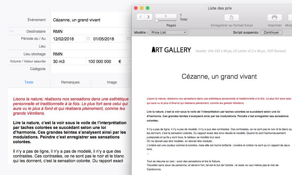vGallery dispose, pour chaque module, de nombreux modèles d’impression intégrés et, pour certains, la possibilité d’en créer en nombre infini. La création et, dans une moindre mesure, la modification des modèles d'impression personnalisés, est une tâche qui demande une certaine connaissance de FileMaker Pro, ce qui incite nos clients à nous la confier volontiers.