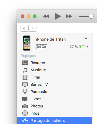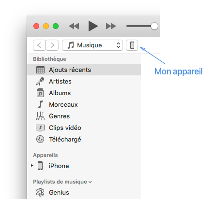 3. iTunes devrait reconnaitre immédiatement votre appareil et l’afficherait sous la forme d’une icône en haut à gauche de la fenêtre principale. Cliquez sur cette icône (voir capture 1 Mon appareil ).