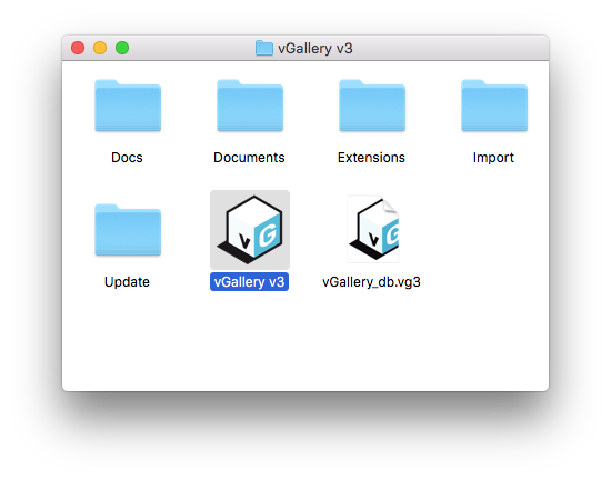 3. Pour lancer vGallery, double-cliquez sur l'icône vGallery v3 qui se trouve à l'intérieur du dossier vGallery v3 (voir image ci-dessous). Nous vous conseillons de placer vGallery dans le Dock ou de créer un alias sur le bureau pour pouvoir le lancer rapidement.
