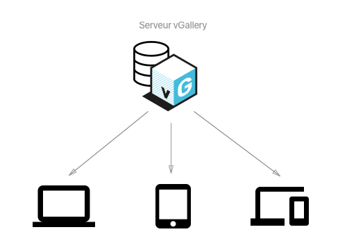 vGallery peut être partagé sur un réseau local ou distant afin d’être utilisé simultanément par plusieurs postes de travail. Un poste de travail peut être aussi bien un ordinateur, qu'un iPhone ou un iPad. Le partage nécessite l’utilisation de FileMaker Pro 16 ou supérieur sur un ordinateur, ou FileMaker Go sur un appareil iOS. Ces logiciels doivent être acquis auprès de FileMaker Inc.