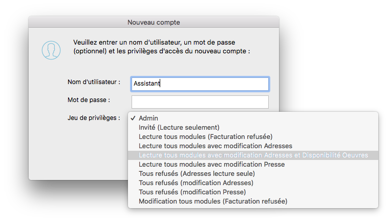 L’accès à vGallery peut être régulé par la création de plusieurs comptes utilisateur disposant de droits spécifiques. Pour accéder au gestionnaire des comptes, choisissez Fichier > Gérer les comptes utilisateur depuis la barre des menus.