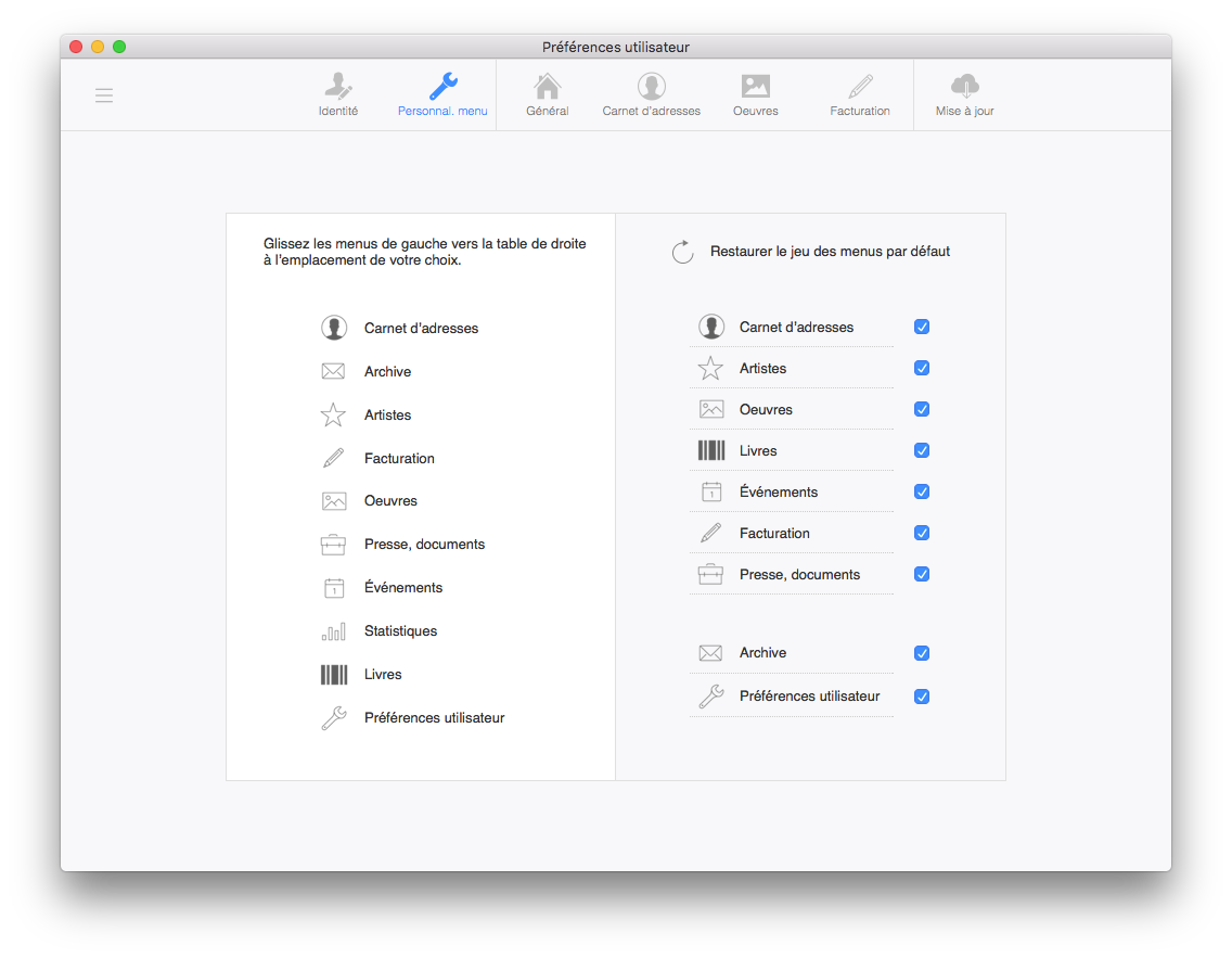 Ici vous pouvez changer l’ordre des menus présents dans la fenêtre du menu principal et masquer les menus donnant accès aux modules non utilisés.