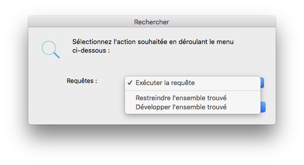 Si vous devez effectuer une recherche multicritères, utilisez le bouton Rechercher ou le raccourci clavier Ctrl+F (Windows) ou Pomme*+F (macOS). Votre fenêtre passe en mode Recherche. Toutes les rubriques qui vous servent ordinairement à entrer ou à afficher des informations seront transformées en champs de recherche. Validez la recherche en cliquant à nouveau sur le bouton Rechercher ou en pressant la touche Retour ou Entrée du clavier.