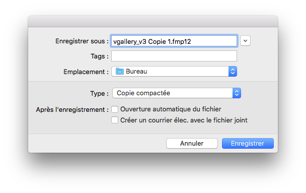 Si vGallery est hébergé par un serveur FileMaker, les sauvegardes doivent être programmées sur celui-ci par l'administrateur du serveur. Si vGallery est hébergé par Zoftware, outre les sauvegardes effectuées par nos soins, vous avez la possibilité de sauvegarder manuellement votre base de données en allant à Fichier -> Enregistrer une copie...