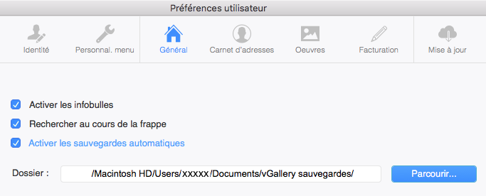 Sauvegardez les informations que vous entrez dans vGallery le plus souvent possible. Vous n'êtes jamais à l'abri d'une erreur de manipulation, d'une panne de disque dur ou d'une coupure de courant qui risquerait de corrompre sa base de données.
